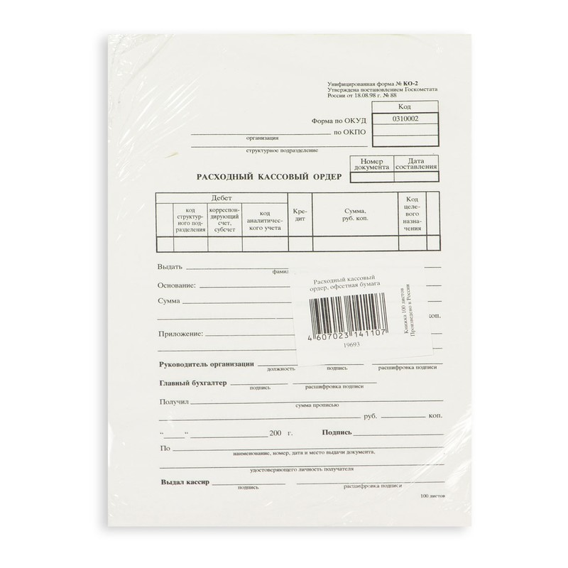 Бухгалтерские бланки — расходный кассовый ордер, унифицированная форма КО-2. Применяются для учета и оформления кассовых операций на предприятии. Бланки отпечатаны на офсетной бумаге формата А5, склеены по 100 штук в виде книжки. В комплекте 5 книжек, упакованных в термоусадочную пленку.
