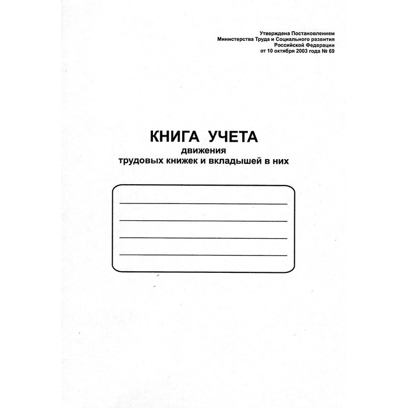 Бухгалтерская книга для учета движения трудовых книжек и вкладышей в них. Обложка изготовлена из картона белого цвета. Внутренний блок — офсетная бумага, 48 листов, крепится к обложке с помощью скрепок.