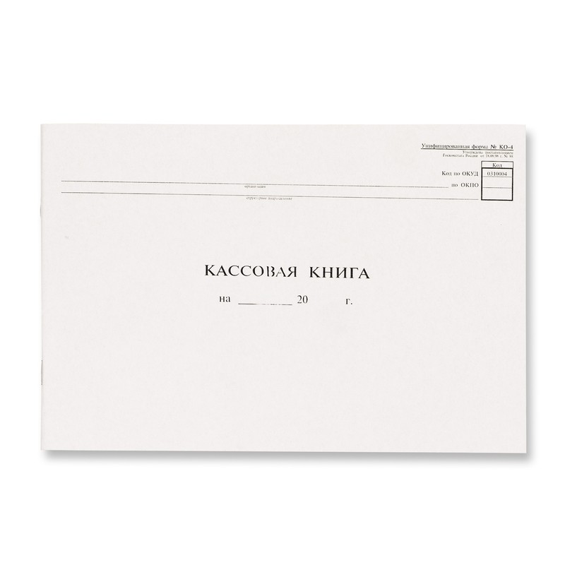 Бухгалтерская кассовая книга формы NКО-4 (формат А4, горизонтальная). Обложка изготовлена из картона. Внутренний блок — газетная бумага, 48 листов. Способ крепления — скрепки.