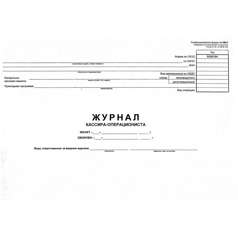 Журнал для ведения бухгалтерской отчетности кассиром-операционистом, форма КМ-4. Обложка изготовлена из картона белого цвета. Внутренний блок — газетная бумага, 48 листов, крепится к обложке с помощью скрепок. Выполнен в формате А4. 6 колонка 2 см, 9 колонка 2 см.