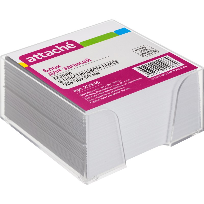 Название торговой марки Attache Торговая марка Attache Материал пластик Размер изделия 90x90x50 мм Схема вложения 24 Цвет бумаги белый Белизна 92-100 % Артикул 25545 -