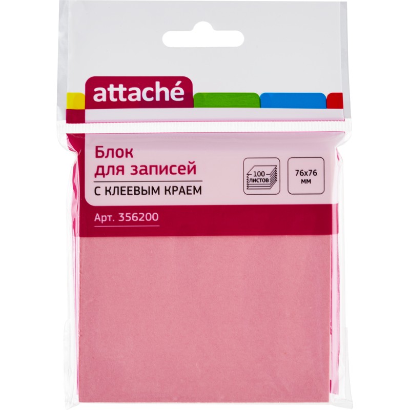 Бумага для заметок с клейким краем Attache. Размер — 76×76 мм, пастельная, розового цвета. Плотность бумаги составляет 62 г/кв.м. В упаковке 100 листов. После удаления бумаги на поверхности не остается следов клеевого состава, лист можно крепить повторно.
