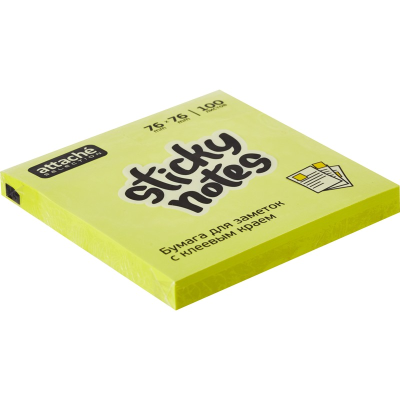 Бумага для заметок с клейким краем Attache. Размер — 76×76 мм, неоновая, желтого цвета. Плотность бумаги составляет 75 г/кв.м, клейкий слой — 20 Н/м. В упаковке 100 листов. После удаления бумаги на поверхности не остается следов клеевого состава, лист можно крепить повторно.