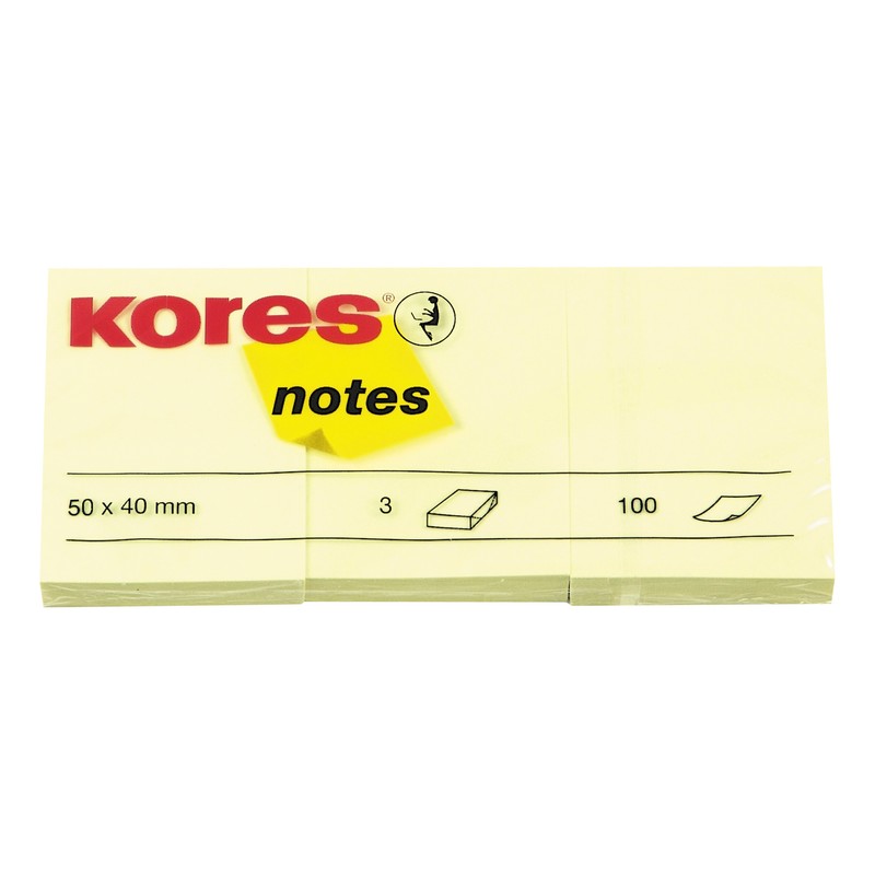 • Бумага для заметок с клейким краем Kores. Размер — 50×40 мм, пастельная, желтого цвета. Плотность бумаги составляет 75 г/кв.м, клейкий слой — 20 Н/м. В упаковке 3 блока по 100 листов. После удаления бумаги на поверхности не остается следов клеевого состава, лист можно крепить повторно.