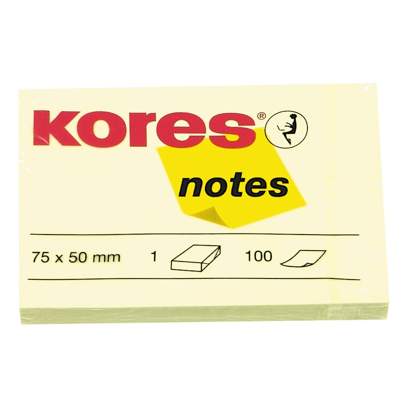 Бумага для заметок с клейким краем Kores. Размер — 75×50 мм, пастельная, желтого цвета. Плотность бумаги составляет 75 г/кв.м, клейкий слой — 20 Н/м. В упаковке 100 листов. После удаления бумаги на поверхности не остается следов клеевого состава, лист можно крепить повторно.