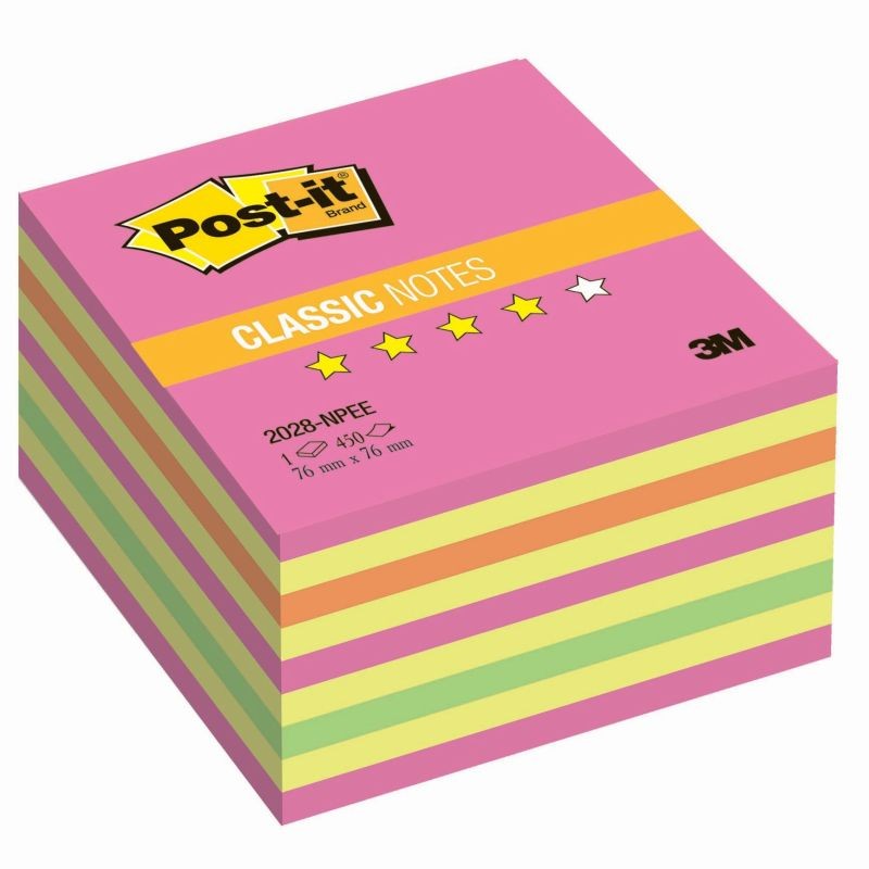 Post-it с клейким краем. Размер — 76×76 мм, неоновые, розового цвета. Плотность бумаги составляет 80 г/кв.м, клейкий слой — 27Н/м . В упаковке 450 листов. Стикеры отлично держатся на любых поверхностях и предметах. После удаления бумаги на поверхности не остается следов клеевого состава, лист можно крепить повторно. -