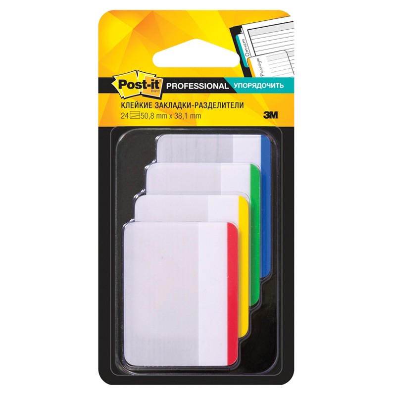 Усиленные самоклеящиеся закладки Post-it шириной 50 мм помогают выделить и систематизировать нужную информацию в документах, архивах, подвесных регистратурах, каталогах. Выполнены из тонкого пластика, подходят для нанесения надписей. Прозрачная клейкая часть не закрывает текст. Не оставляют следов клея, могут многократно переклеиваться. В упаковке 24 закладки — по 6 с полосками каждого из четырех цветов.