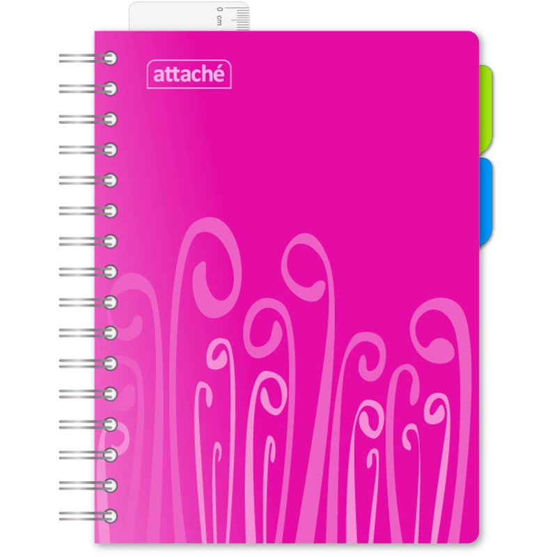 Бизнес-тетрадь Attache Fantasy. Модель розового цвета, в твердой обложке из износоустойчивого пластика с приятной текстурой, комплектуется съемной линейкой-закладкой и двумя съемными цветными разделителями. Блок бизнес-тетради состоит из 140 листов белой офсетной бумаги формата А5, разлинованных в клетку. На страницах имеются поля и разметка для дополнительной информации. Бизнес-тетрадь оборудована креплением в виде серебристой спирали увеличенного диаметра.