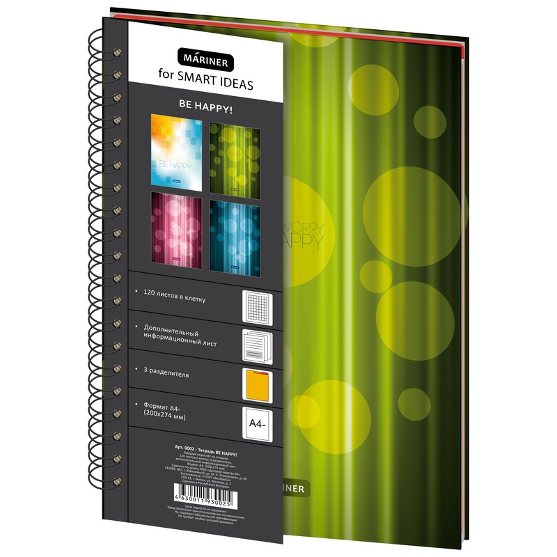 Бизнес-тетрадь Mariner Be Happy формата А4, 120 листов. Модель зеленого цвета, в обложке из твердого картона с матовой ламинацией, в оформлении использованы яркие краски. Бизнес-тетрадь снабжена информационным листом и тремя разделителями. Блок включает 120 листов офсетной бумаги плотностью 60 г/кв.м, тип крепления — спираль. Листы в клетку, белизна 100%. Тетрадь поставляется в термоусадочной пленке.