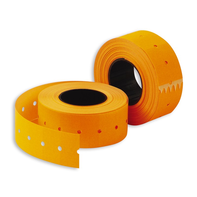 Лента оранжевого цвета с этикетками прямоугольной формы размером 12×21,5 мм предназначена для этикет-пистолетов. Этикетки вмещают до двух строк символов. Поставляется по 200 рулонов в упаковке, один рулон состоит из 800 этикеток.