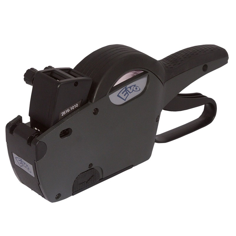 Этикет-пистолет EVO с эргономичным дизайном предназначен для маркировки товара этикетками с ценой, артикулом, датой, сроком годности и т.д. Работает только с прямоугольными этикетками размером 26×16 мм. Двустрочный, максимальное количество знаков в каждой строке — 10. Поддерживает цифры и значки валют (включая рубль, доллар, евро). Сменный красящий элемент — чернильный ролик.