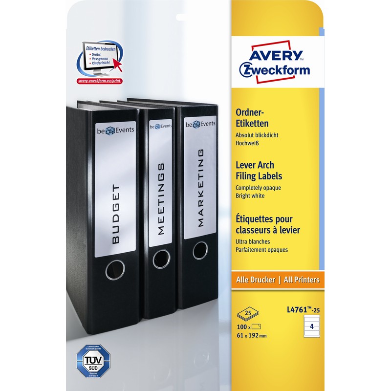 Этикетки бумажные самоклеящиеся Avery Zweckform — решение для маркировки папок-регистраторов. Имеют прямоугольную форму, закругленные края. Подходят для печати на лазерных и струйных принтерах, их легко оформить с помощью программного обеспечения от Avery. В упаковке 25 листов по 4 этикетки размером 192×61 мм. Цвет белый.