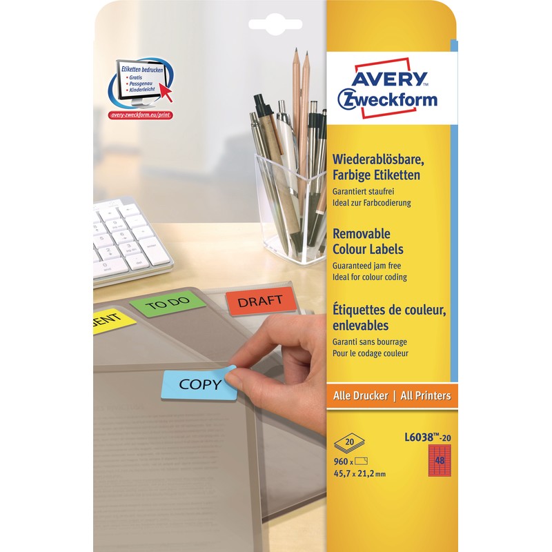 Этикетки бумажные самоклеящиеся Avery Zweckform — решение для выделения документов, организации папок, накопителей, образцов, маркировки различных предметов. Имеют прямоугольную форму, закругленные края. Яркий красный цвет привлекает внимание. Мини-этикетки подходят для печати на лазерных и струйных принтерах, их легко оформить с помощью программного обеспечения от Avery.