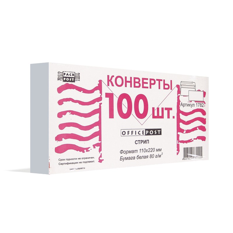 Конверт E65 110х220 мм выполнен из офсета 80 г/м2, имеет клеевое нанесение типа стрип (отрывная силиконовая лента). Предназначен для почтовых отправлений различной документации, писем и т.п. Упакован в пленку по 100 штук. Срок годности не ограничен.