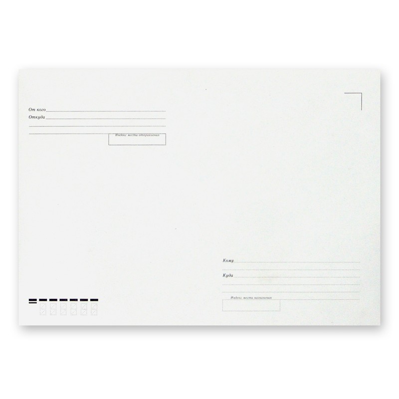 Конверт С4 229х324 мм выполнен из офсета 115 г/м2, не имеет клеевого нанесения на клапане, клапан треугольный, почтовый подсказ "Куда-Кому".