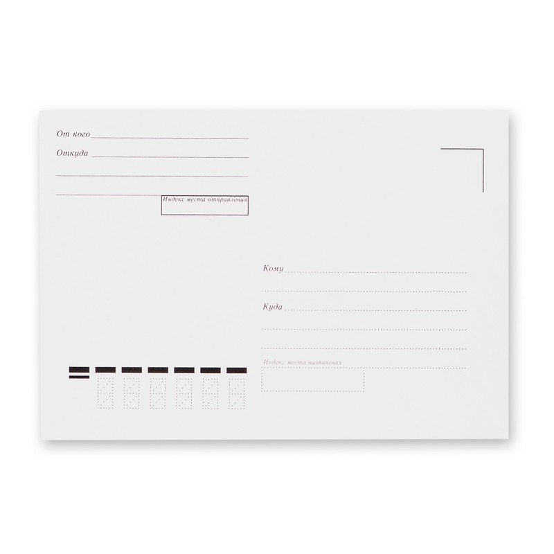 Конверт С6 114х162 мм выполнен из офсета 80 г/м2, имеет клеевое нанесения типа декстрин (смачиваемый или водорастворимый клей), клапан треугольный, почтовый подсказ "Куда-Кому".