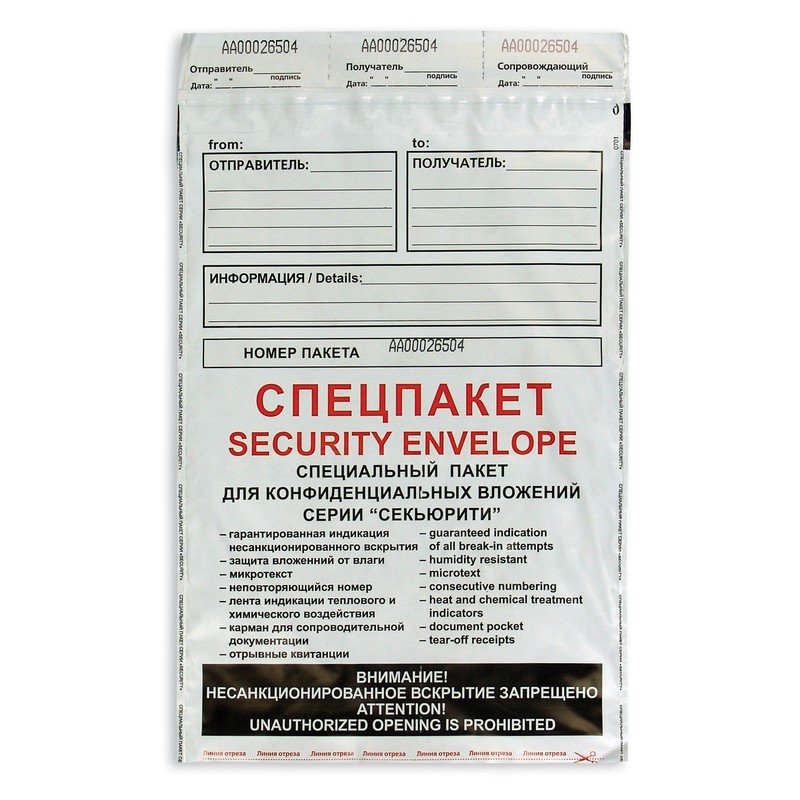 Специальный пакет для конфиденциальных вложений Security формата B4 (размер 250×353 мм) изготовлен из трехслойного непрозрачного полиэтилена толщиной 70 мкм. Имеет ряд особенностей, отличающих его от стандартных почтовых пакетов и конвертов: наличие специального кармана для сопроводительных документов; уникальный номер, дублирующийся на отрывных корешках; индикаторы несанкционированного вскрытия, включая специальный прочный шов с нанесенным микротекстом. При попытке открывания клейкая лента меняет внешний вид или рвется по перфорации.