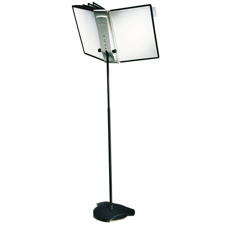 Напольная демонстрационная система Durable Sherpa Floors Stand черного цвета имеет устойчивое металлическое основание весом 4,9 кг. Предназначена для представления информации, фотографий на выставках, в торговых залах, банках и т.д. Регулируемый штатив позволяет расположить материалы на удобной высоте (от 87 до 138 см). В каждой из десяти демопанелей можно разместить по два листа формата А4. Панели изготовлены из прочного прозрачного материала с антибликовым покрытием, оснащены закладками-табуляторами для маркировки и быстрого поиска. Надежно защищают документы от внешних воздействий, обеспечивают качественную презентацию. Угол наклона цоколя регулируется от 5 до 90 градусов. Демосистема легко собирается без инструментов.