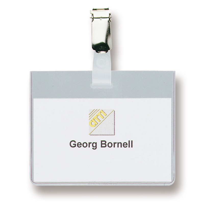 Горизонтальные бейджи Durable с металлической клипсой имеют размер 90×60 мм, предназначены для ношения именной карточки. Изготовлены из твердой прозрачной пленки. Поставляются упаковками по 5 штук.