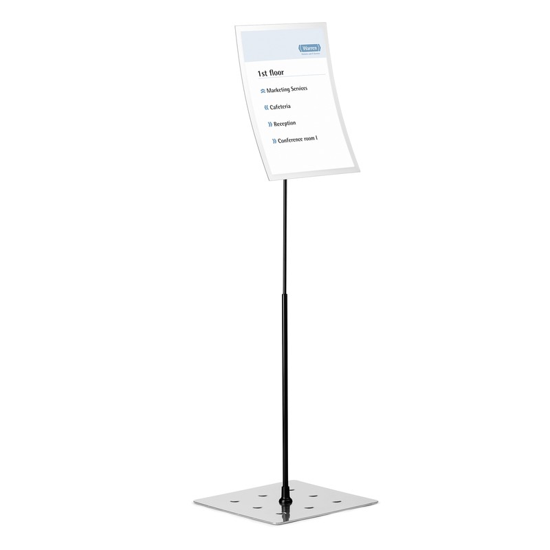 Напольный стенд Durable Duraview предназначен для презентации информации как в помещении, так и на улице. Выполнен из металла, имеет телескопическую ножку и утяжеленное основание, обеспечивающее устойчивость. Информационная панель формата А3 может располагаться в горизонтальном и вертикальном положениях под разными углами наклона. Магнитная рамка обладает антибликовыми свойствами. Стенд укомплектован необходимыми для монтажа крепежными элементами.