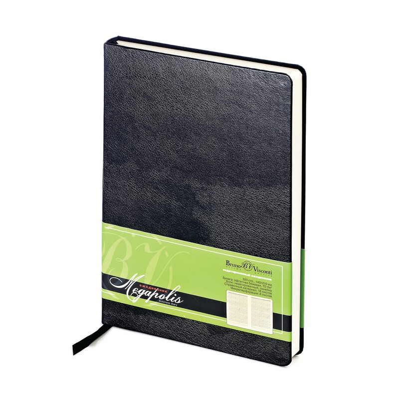 Ежедневник недатированный Bruno Visconti Megapolis формата А5, размер 144×215 мм. Обложка из искусственной кожи черного цвета, с закругленными уголками. Бумажный блок бежевого цвета. Есть ленточка-закладка. Количество листов — 160.