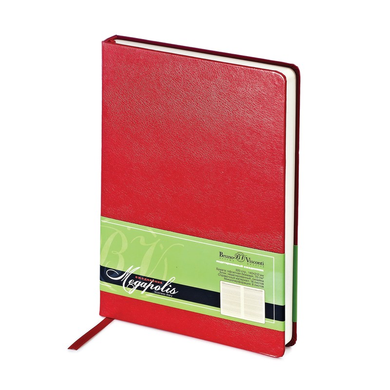 Ежедневник Bruno Visconti Megapolis формата А5, размер 144×215 мм. Обложка из искусственной кожи красного цвета, с закругленными уголками. Бумажный блок бежевого цвета. Есть ленточка-закладка. Количество листов — 160.