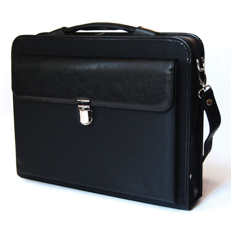 Материал - комбинация полиэстера и искусственной кожи. Имеет жесткий каркас. Три объемных внутренних отделения, внешний объемный карман с клапаном на замке, отделения для ручек и визиток. Карман на молнии на задней стенке. Съемный регулируемый ремень.