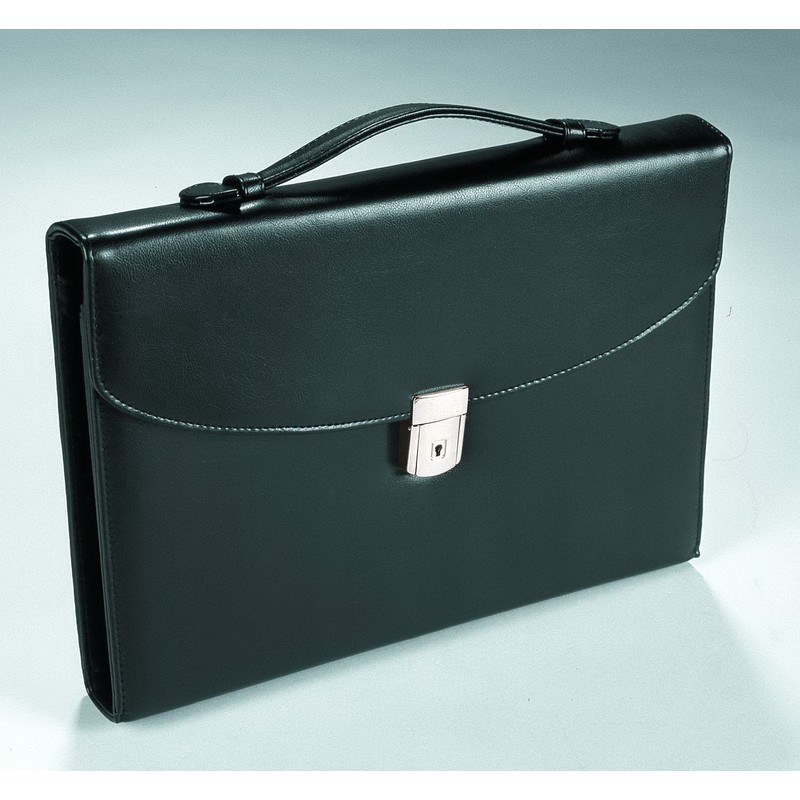 Материал - искусственная кожа. Закрывается клапаном на замке. Три объемных внутрених внутренних отделения, плоский карман для документов, отделения для ручек и визиток. Цвет чёрный.