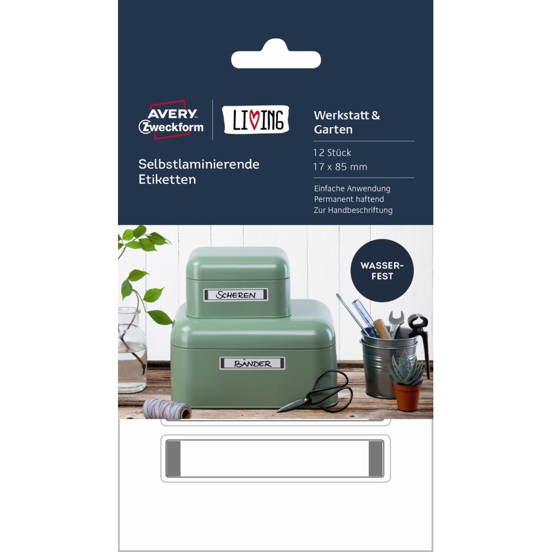 Самоклеящиеся самоламинирующиеся этикетки Living белого цвета имеют размер 17×85 мм. В упаковке 12 штук (2 листа по 6). Вы можете подписать этикетку и самостоятельно защитить надпись с помощью специальной пленки — просто и быстро. Этикетки не предназначены для печати на принтерах.