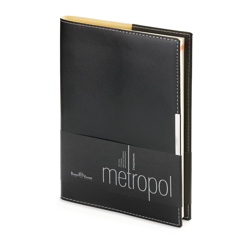 Ежедневник недатированный Metropol формата А5, размер 143×216 мм. Ежедневник выполнен в гибкой обложке из прочного переплетного материала. Обложка украшена металлическим шильдиком. Блок состоит из 272 страниц, сделанных из бежевой бумаги плотностью 70 г/кв.м. На 18 первых страницах размещена справочная информация с ценными сведениями из разных областей. Количество листов — 136.