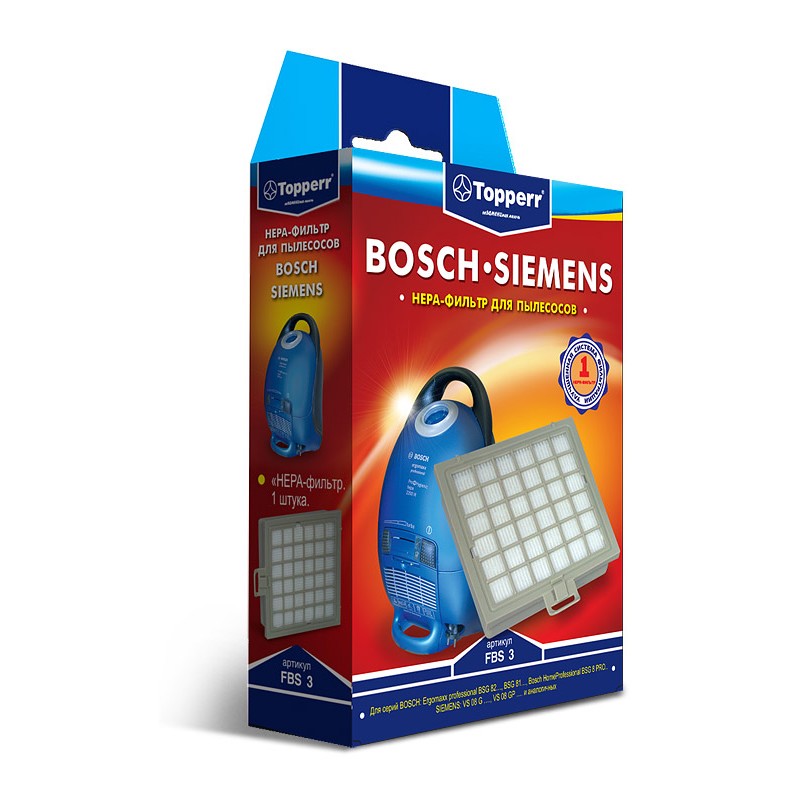 HEPA-фильтр FBS 3 для пылесосов BOSCH и SIEMENS. Обладает высочайшей степенью фильтрации, задерживает 99,5% пыли. Благодаря специальным свойствам фильтрующего материала, фильтр улавливает мельчайшие частицы, позволяя очищать воздух от пыльцы, микроорганизмов, бактерий и пылевых клещей. Тип оригинального фильтра: BBZ151HF. Подходит для арт. 378754