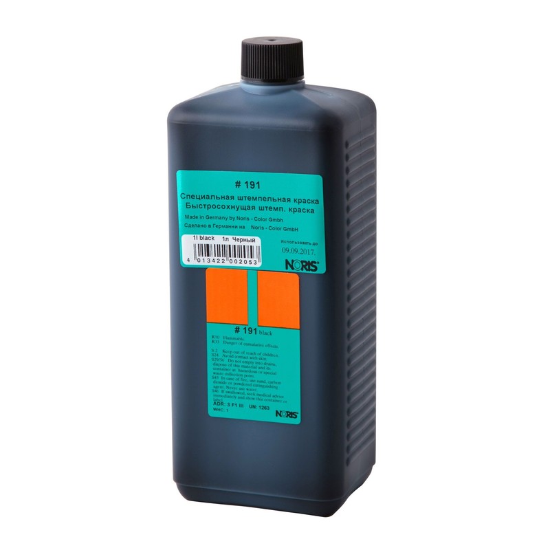 Краска штемпельная универсальная NORIS 191Е черная 1000мл Германия. Специальная универсальная штемпельная краска на водной основе с содержанием спирта. Предназначена для проставления маркировки на непористые поверхности (кроме полиэтилена, полипропилена): глянцевую бумагу, картон, олово, свинец, железо, медь, платину, пластмассу, дерево, фанеру, ткань, целлофан, черепицу, кирпич, бетон, керамику, керамическую плитку, фарфор, эмаль, стиропор, стекло, CD диски и т.д. Используется с ручными печатями и штампами. Важно знать, что использование универсальных красок рекомендуется только с клише из высококачественной резины, так как под воздействием спиртов клише из некачественной резины и всех типов полимера теряет контуры, разрушается. Время высыхания - от 5 до 300 секунд, в зависимости от поверхности. Цвет - черный. Объем - 1000мл. Минимальный срок хранения 2 года. Для предотвращения преждевременного высыхания, экономии расхода рекомендуется использовать только штемпельные подушки со специальным слоем для спиртосодержащих красок Multipad или универсальным слоем Colop Micro 1 неокр.