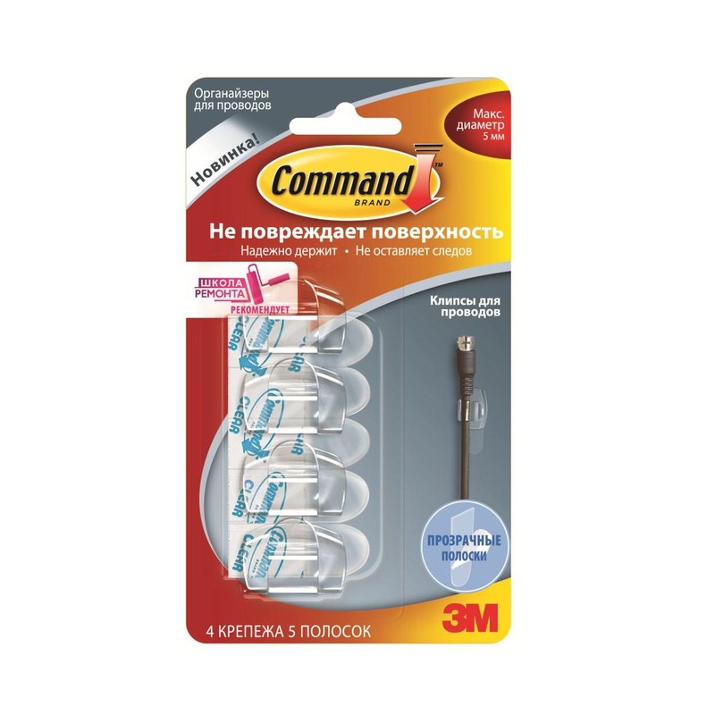 | Крючок для проводов COMMAND прозрачный, арт 17017CLR RU,4шт/уп |