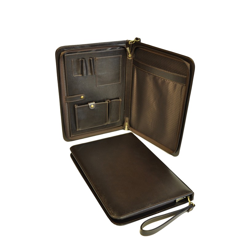 Папка деловая кожаная коричневого цвета закрывается на молнию. Имеет внутренний объемный карман с цупфером, карандашник, наборную визитницу, карман для дисков и телефона, а также горизонтальный карман. Снабжена малой ручкой-петлей. Размеры деловой папки — 380×260×30 мм.