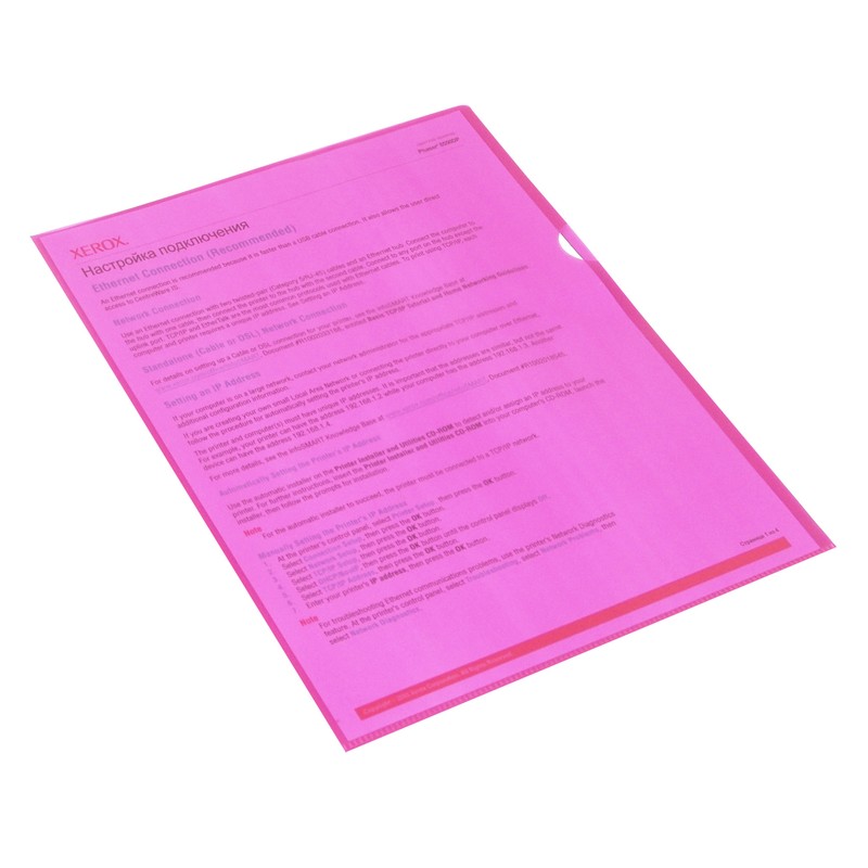 Папка-уголок формата А4 изготовлена из мягкой полипропиленовой пленки. Толщина пленки — 100 мкм. Папка вмещает до 40 листов стандартной плотности. В упаковке 10 штук.