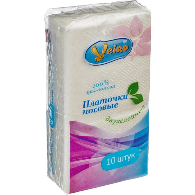 Платки носовые бумажные Veiro 2-слойные неароматизированные белого цвета. В одной упаковке 10 платочков.