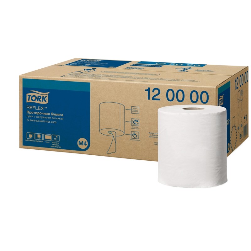 Протирочная бумага в рулонах с центральной выияжкой, система М4. 1 слой, 100% целлюлоза премиального качества. Белизна 86%. Граммаж 1х23 г/м2. Бесцветное объемное тиснение поверхности. Съемная картонная втулка. Рулон совместим как с настенным, так и с переносным диспенсером Tork Reflex.
