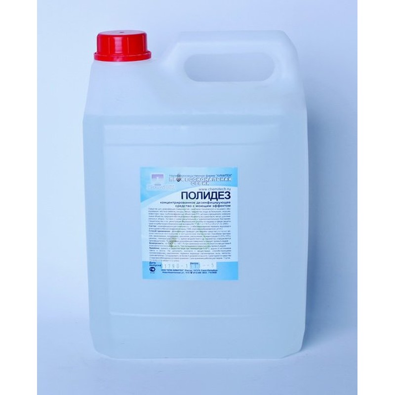 Дезинфицирующее средство «Химитек Полидез» в пластиковой бутыли объемом 5 л. Предназначено для обработки различных поверхностей и предметов — от пищевого и медицинского оборудования до помещений общепита, бассейнов и парикмахерских. Жидкость содержит в основе перекись водорода и аммонийные соединения, обладающие антибактериальным и противогрибковым действием.