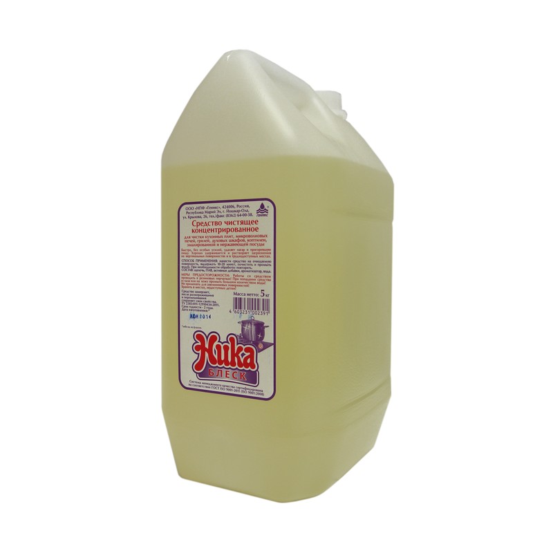 Средство «Ника-блеск» кроме основного назначения — удаления нагара, копоти и пригоревшей пищи — может быть использовано и для санитарной обработки оборудования и помещений. Несмотря на отсутствие в рецептуре дезинфицирующего вещества, средство обладает антибактериальным эффектом в отношении бактерий группы кишечной палочки. Эффект проявляется начиная с концентрации раствора 0,5% и выше. «Ника-блеск» хорошо удерживается на вертикальных поверхностях за счет плотности раствора, имеющего гелеобразную структуру, обеспечивая растворение загрязнений в труднодоступных местах. Удаляет все неприятные запахи, в том числе рыбные, придает приятный аромат. Хорошо смывается водой. Удачное сочетание ПАВ и щелочных добавок делает средство более мягким в использовании. Объем — 5 л. Трудногорючее, свободное от хлора (решается проблема защиты здоровья работников).
