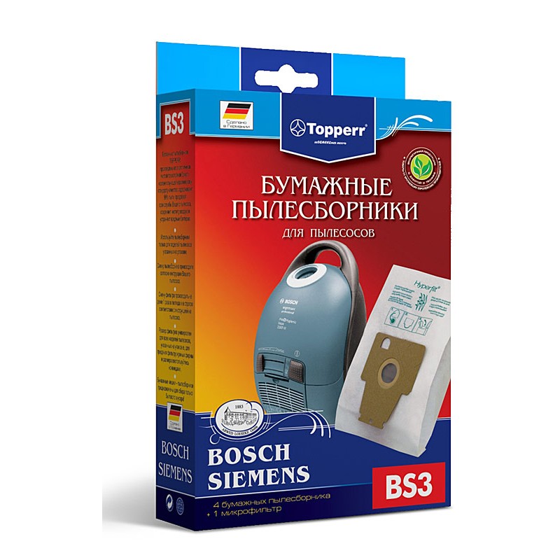Бумажные пылесборники BS3 для пылесосов BOSCH и SIEMENS изготовлены из экологически чистой трехслойной бумаги, соответствующей европейскому стандарту качества, задерживают 99% пыли, продлевая срок службы пылесоса, сохраняют чистоту воздуха и устраняют вредные бактерии. В упаковке: 4 пылесборника и 1 моторный фильтр. Подходит для арт. 378754