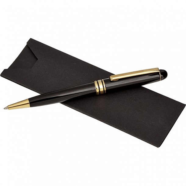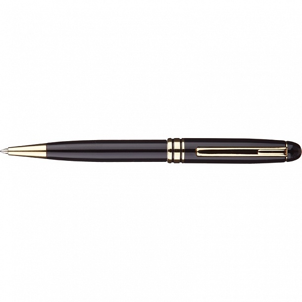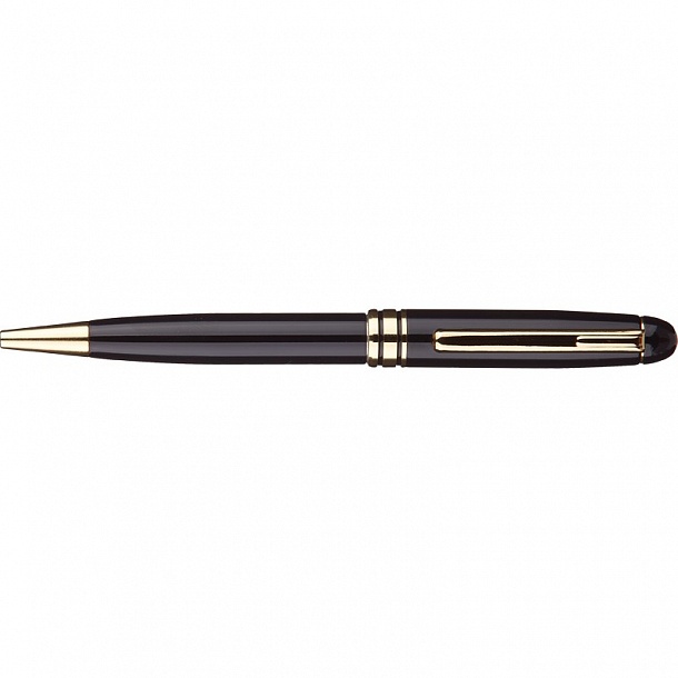 Шариковая ручка Verdie в корпусе из стали с многослойным лаковым покрытием черного цвета с декоративной отделкой <под золото>.Механизм подачи стержня - поворотный. Ручка комплектуется сменным стержнем с чернилами синего цвета, который позволяет наносить линии толщиной 0,5 мм. К ручке прилагается подарочный футляр из картона.