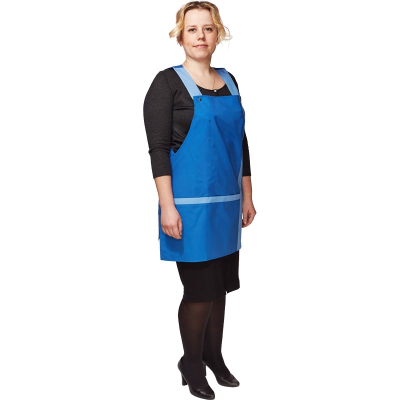 Фартук с бретелями на кнопках, с передним накладным карманом, ширина по талии регулируется завязками. Изготовлен из смесовой ткани «Сису» плотностью 139 г/кв.м (77% полиэфир, 23% хлопок). Цвет фартука — васильковый.