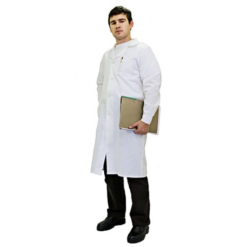 Халат рабочий мужской, застегивающийся на пуговицы, имеет длинные рукава с манжетами на пуговицах. Изделие, предназначенное для использования в летний сезон, выполнено из 100% хлопка плотностью 142 г/кв.м. Халат белого цвета 64-66 размера рассчитан на рост 170-176 см.