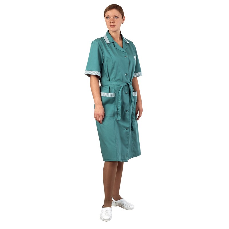Женский халат для торговли и сферы обслуживания «Вилора», размер 64-66, рост 158-164 см. Изготовлен из ткани бирюзового цвета, состав — 65% полиэфира и 35% хлопка. Рукав короткий. Воротник отложной с лацканами, есть накладные карманы. Отлет воротника, верхние части карманов и края рукавов отделаны светлой тканью. Халат застегивается на пуговицы.