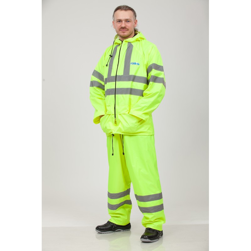 Костюм влагозащитный изготовлен из прочной плащевой ткани с ПВХ-покрытием. Цвет лимонный, светоотражающая полоса шириной 50 мм. Плотность ткани — 225 г/кв.м. Водоупорность — не менее 5000 мм водяного столба. Изделие экологично и соответствует европейским стандартам по содержанию вредных веществ. Куртка с центральной застежкой на молнию и капюшоном. Кулиска на капюшоне и внизу куртки дает возможность регулировать изделие для комфортной персональной посадки. Брюки прямого силуэта. Все швы костюма загерметизированы специальной лентой.