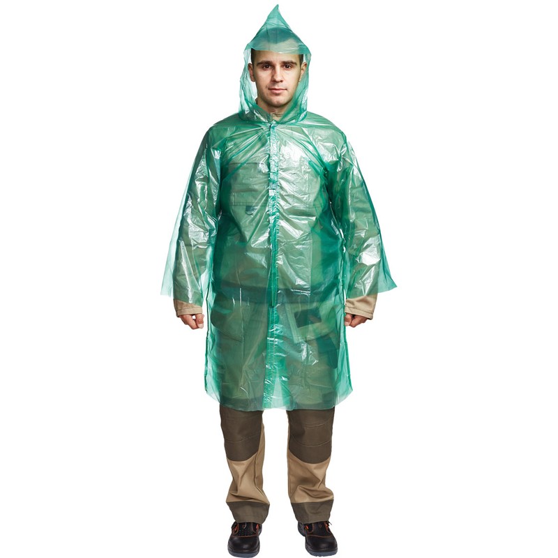 Плащ-дождевик — удобная и экономная модель из плотного полиэтилена. Имеет застежку на липучке. Плотность материала 40 мкм.