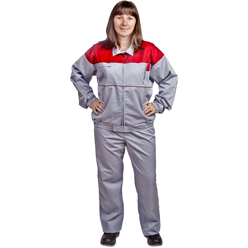 серо-красного цвета. Куртка снабжена центральной застежкой на молнию, верхним карманом для средств связи и двумя боковыми накладными карманами. Брюки с боковыми карманами, задними накладными задним и задним карманом под инструмент, пояс на резинке регулируемой по поясу. Костюм выполнен из смесовой ткани (65% полиэстера и 35% хлопчатобумажных нитей). -