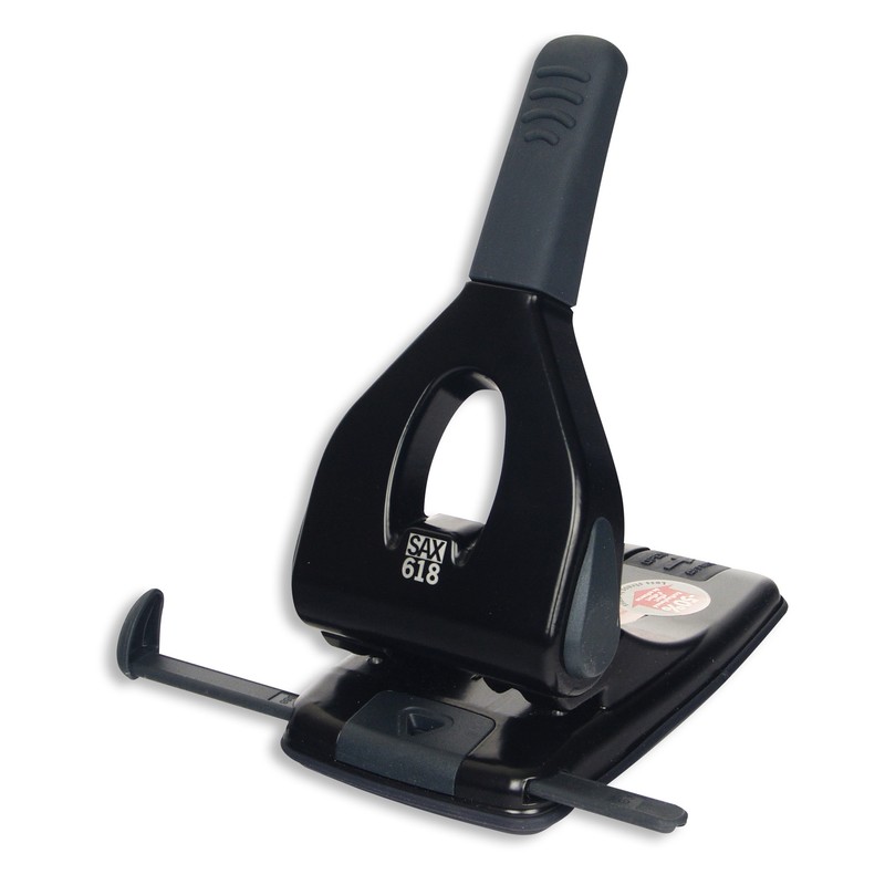 Дырокол модели Sax 618 имеет стильный элегантный дизайн за счет своей формы. Конструкция дырокола оснащена технологией Power assisted, которая снижает прилагаемый уровень усилий в 2 раза. Дырокол может пробить за 1 раз до 65 листов бумаги стандартной плотности. Дырокол пробивает 2 отверстия по 5.5 мм, расстояние между ними составляет 8 см. Контейнер удобный, легко открывается, не просыпает конфетти. Конструкция дырокола предусматривает линейку, которая фиксирует бумагу на определенном расстоянии. Корпус изготовлен из металла черного цвета.