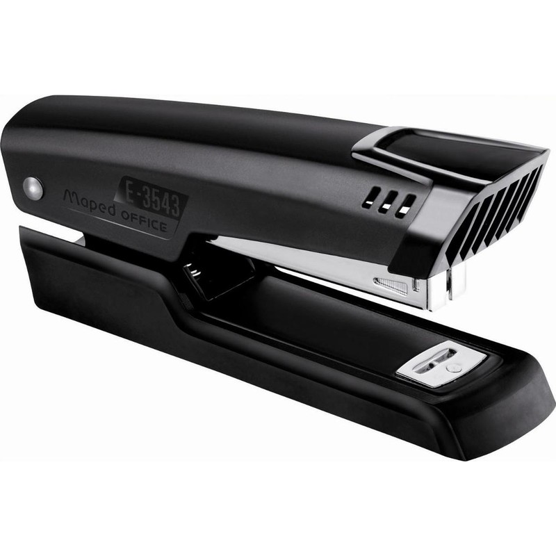 Степлер Maped Essentials настольный – широко используемый канцелярский инструмент для соединения документов, позволяющий сшить за один раз до 25 листов, плотность бумаги которых составляет 80 г/кв.м. Для работы используются скобы металлические № 24/6 и № 26/6. Допустимая закладка листов 6,1 см (61 мм). Корпус изделия изготовлен из прочного металла. Цвет степлера черный.