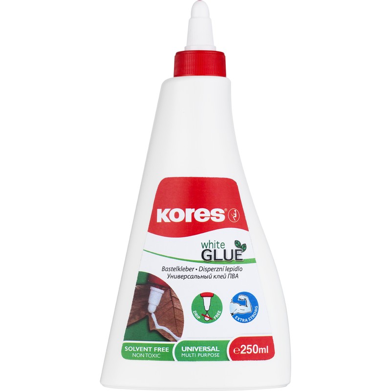 Клей ПВА Kores используется дома и на работе для склеивания изделий из бумаги, текстиля, дерева и других схожих материалов. Данный ПВА выпускается в удобных флаконах объемом 250 мл, которого надолго хватает. Удобный дозатор экономно расходует клей за счет аккуратного нанесения линиями или точками. Клей не содержит вредных веществ, не вызывает аллергических реакций. В случае попадания на руки или рабочую поверхность легко удаляется водой. Клей прочно склеивает поверхности в течение 60 секунд. Устойчив к замерзанию, оттаиванию и нагреванию (сохраняет свои характеристики при температуре от -18 С до +50 С).
